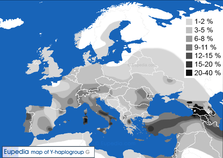В отличии от эрбинов и ариев наша группа G довольно небольшая. Сегодня она составляет примерно 2,5 % населения всего земного шара. В настоящее время гаплогруппа G представлена в Европе очень слабо и находится, в основном, в горных районах, например, в Кантабрии (более 10%), на севере Испании, Швейцарии (10%), Австрии (8%), Овернь (8%) в центральной Франции, горных районах Чехии (от 5 до 10%) и Уэльсе (4%).