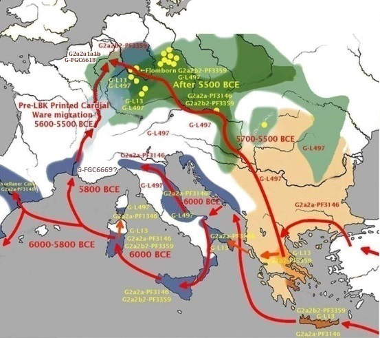 Примерно 8-9 тыс. лет назад, представители группы G2а через Анатолию (территория современной Турции) проникли в Европу и принесли с собой мелкое животноводство и сельское хозяйство. Крупный рогатый скот (коров, например) они не держали так как у них была непереносимость лактозы. Крупный рогатый скот был завезён в Европу позже aриями (R1a) и эрбинами (R1b), которые пили парное или сырое молоко и прекрасно усваивали лактозу.