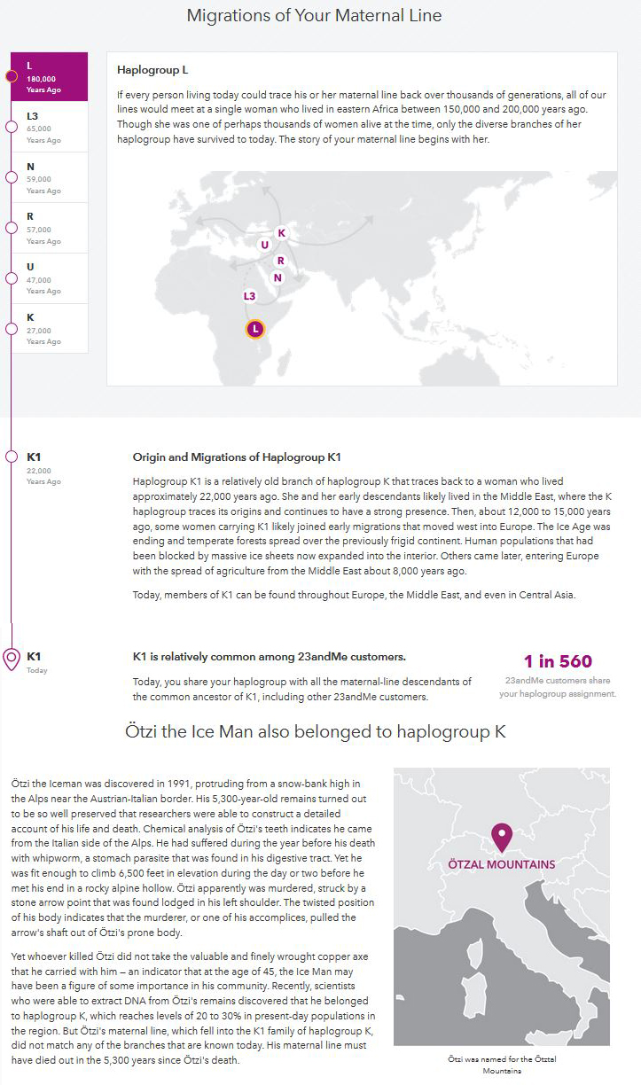 Митохондриальный тест сообщил немного о моих предках женщинах по материнской линии. Предки мои принадлежали к гаплогруппе К1. История этой гаплогруппы на удивление похожа на историю гаплогруппы отца. Образовалась группа 22 тысячи лет назад на Среднем Востоке. В начале мезолита (12-15.000 лет назад) начала мигрировать в сторону Европы и достигла её примерно 8.000 лет назад. Ещё одно совпадение - моя мама и мама Еци имели одну и ту же гаплогруппу. Таким образом, мы с Еци братья как по отцовской, так и по материнской линии:-). Сегодня представителей группы К1 можно встретить в Европе, на Среднем Востоке и в Центральной Азии. К тесту так же прилагается хронология маркеров группы К1, найденных в моём МтДНК.
