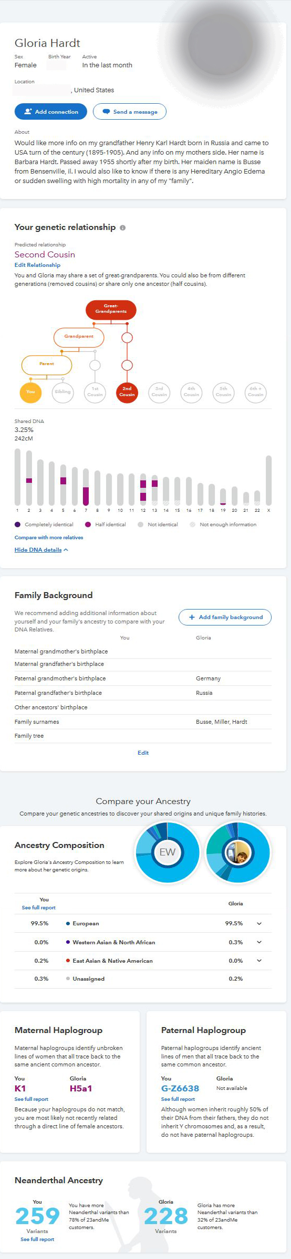 Теперь ко второй части теста - "согласованию" (Matching). Работники сайта 23andMe периодически сообщают мне о том, что ими были проанализированы ДНК других персон и найдены общие куски ДНК с моим геномом. На сегодняшний день найдено 1355 таких персон. Я скопировал сравнительный тест одной из таких персон. Её зовут Глория Хардт и проживает она в США. Наши с Глорией ДНК имеют идентичные куски (3,25% (242 см) от всего ДНК) в шести из 23х хромосом. На основе этого специалисты сайта 23andMe делают вывод, что мы с Глорией можем быть четвероюродные брат и сестра или она может быть мне троюродной тётей. Не хочется спекулировать на тему нашего родства, но возможно моя прабабушка по отцовской линии Мария Христина Хердт (род. 1878 в Александерге) была сестрой или тётей деда Глории, который уехал в США из России в период 1895-1905 годов. Возможно его фамилию по прибытии записали, как слышали по-английски "Hardt" ("а" по-английски произносится как "э", к примеру Том Хэнкс - Tom Hanks).
