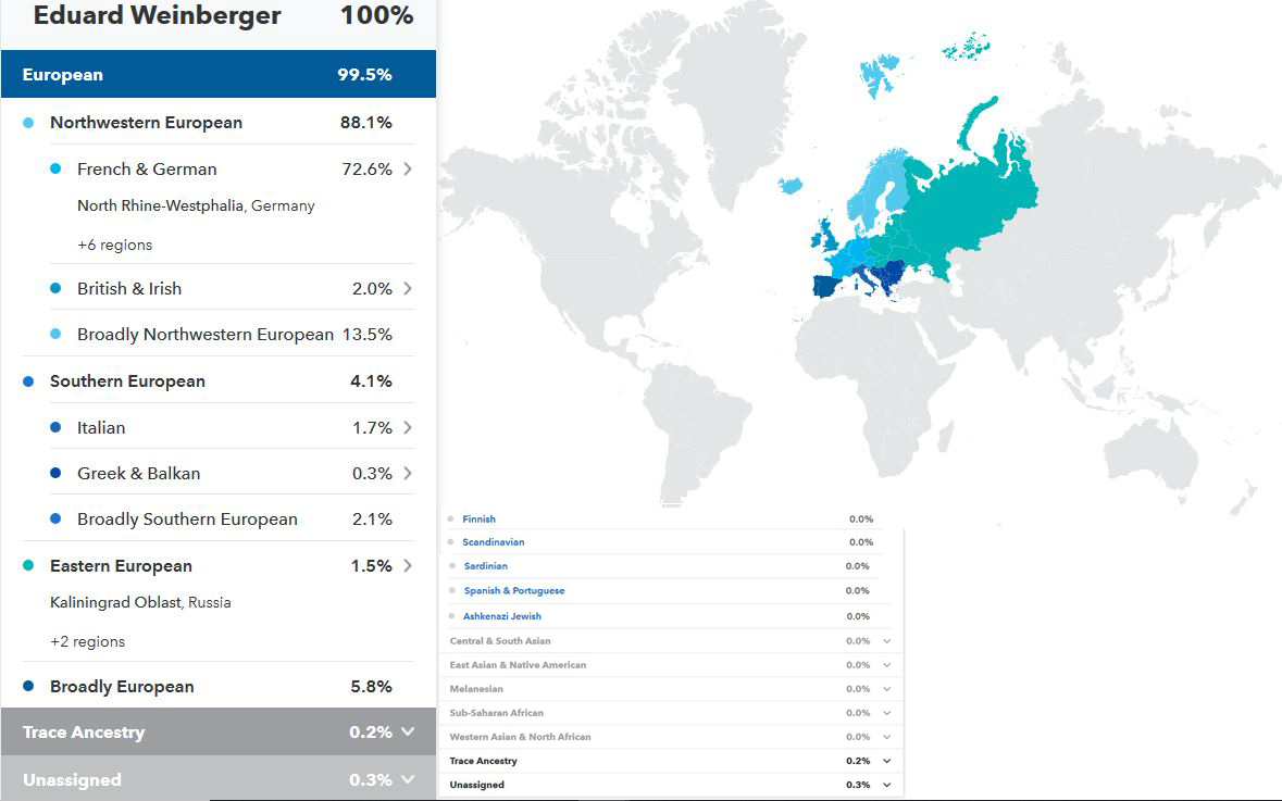 Во-первых - я на 100% европеец. Доказанных 99,5%, стальные 0,5% погрешность при расчётах. Это успокаивает. В моих жилах течёт в основном немецкая и французская кровь (72,6%). Немецкая - это понятно, а вот о возможной французской крови я узнал совсем недавно, когда собирал буквально по кусочкам генеалогическое дерево моей бабушки по материнской линии (Катарины Капп). Один из предков моей бабушки по её материнской линии (Франц Мармис) приехал в колонии на Волге (в 1766м году в колонию Герцог) из Франции. Так же к моему генофонду приложились и представители северо-западной Европы (13,5%) и понемногу другие народы Европы. В моих жилах совершенно нет африканской, азиатской, меланезийской, американской (индейцы) и арабской крови. Так же, к моему большому удивлению, у меня не оказалось и крови евреев ашкенази, хотя большинство моих друзей и родственников убеждены в том, что она у меня быть просто обязана:-).