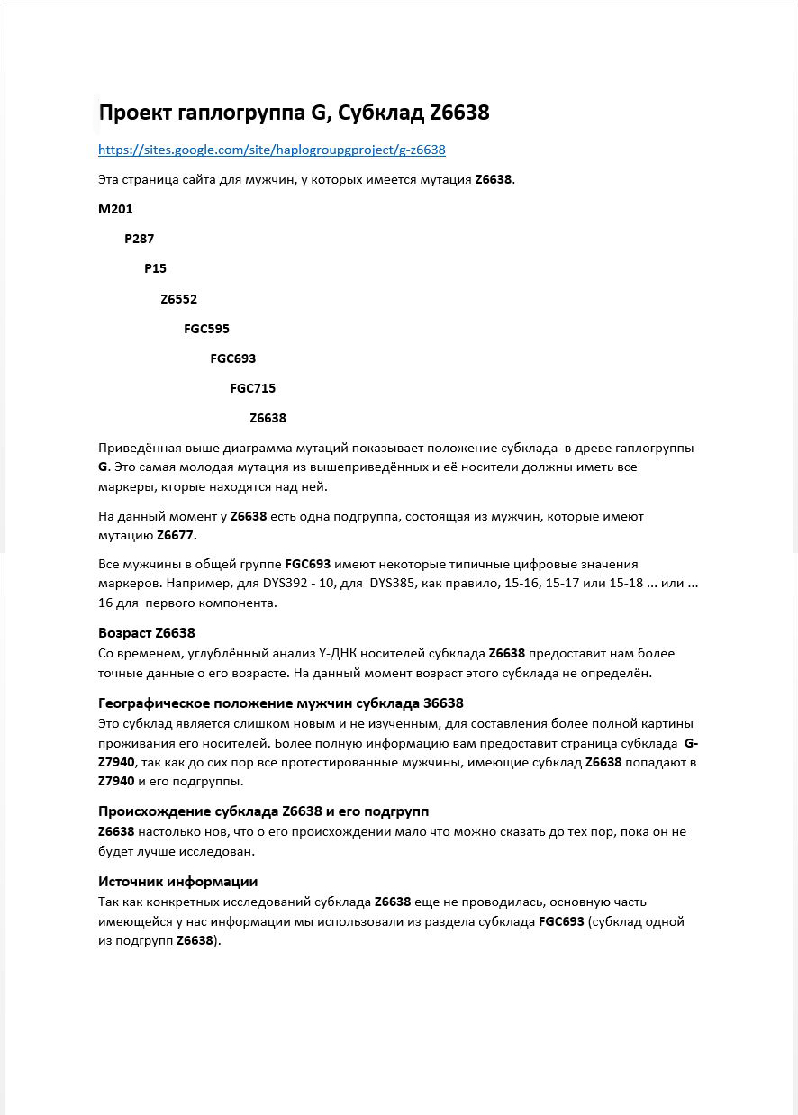 В интернете, к сожалению, информации о субкладе Z6638 в свободном доступе практически нет. На сайте проекта гаплогруппы G я нашёл страницу с информацией о моём субкладе. Намного дальше меня эта находка не продвинула. Возраст, происхождение и миграция субклада Z6638 неизвестны, так как субклад этот новый и слишком мало изученный. Специалисты некоторых других генеалогических сайтов предполагают, что наш субклад мог образоваться примерно 4.500-5.000 лет назад. Да, говоря словами Остапа Бендера: "У нас есть наличие отсутствия".