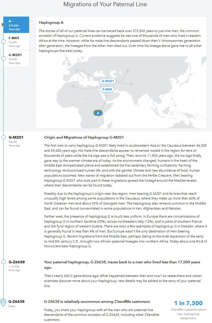Первый ДНК Тест определил нашу гаплогруппу G и субклад Z6638 , который определяет нас к соответствующему роду. У всех потомков этого рода в ДНК есть субклад Z6638. Где и когда возник этот субклад никому неизвестно. До сих пор археологи не обнаружили ни одного древнего ДНК материала, содержащего эту мутацию. Учёные пытаются вычислить возраст этой мутации лишь при сравнении ДНК-тестов мужчин, которые имеют этот субклад и другие, которые образовались позже и дали начало новым дочерним подгруппам субклада Z6638. На данный момент на основе таких вот вычислений специалисты 23andMe предполагают возраст этой мутации в 17.000 лет.