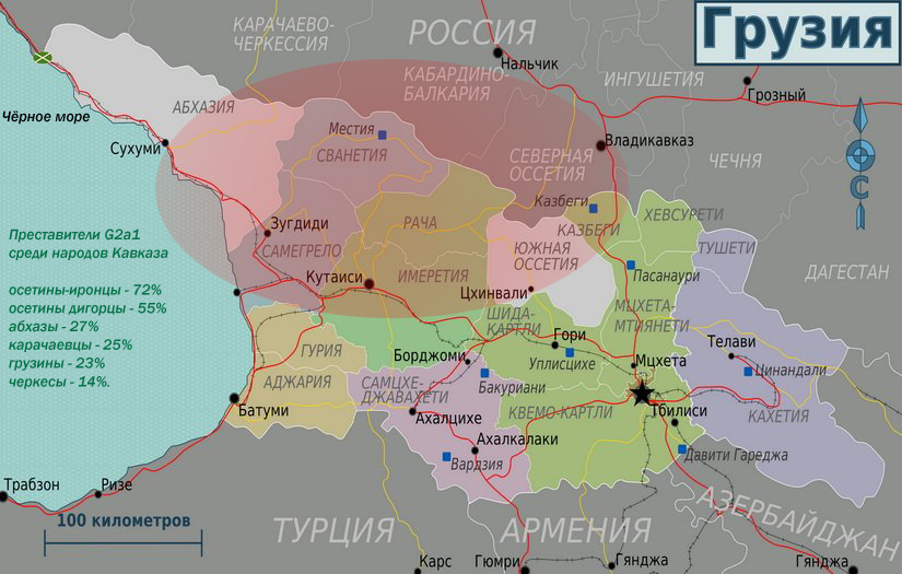 Если взглянуть на карту Грузии и северного Кавказа, то можно заметить, что подавляющее большинство представителей нашего рода G2а1 живут плотно и компактно в определённом районе на северо-западе Кавказа с двух сторон Главного Кавказского хребта. На этой карте можно посмотреть ареал их проживания, в котором они являются доминантным (или одним из доминантных) родом. Наблюдая такую плотность и непрерывность их поселения, можно предположить, что у них мог быть один общий предок (назовём его условно "патриарх-колхидец"), который пришёл на Кавказ или родился там примерно 5.000 лет назад. Постепенно его потомки расселились на этой территории, где и проживают до сегодняшнего дня. На данный момент - главный вопрос, на который мне нужно ответить, это: