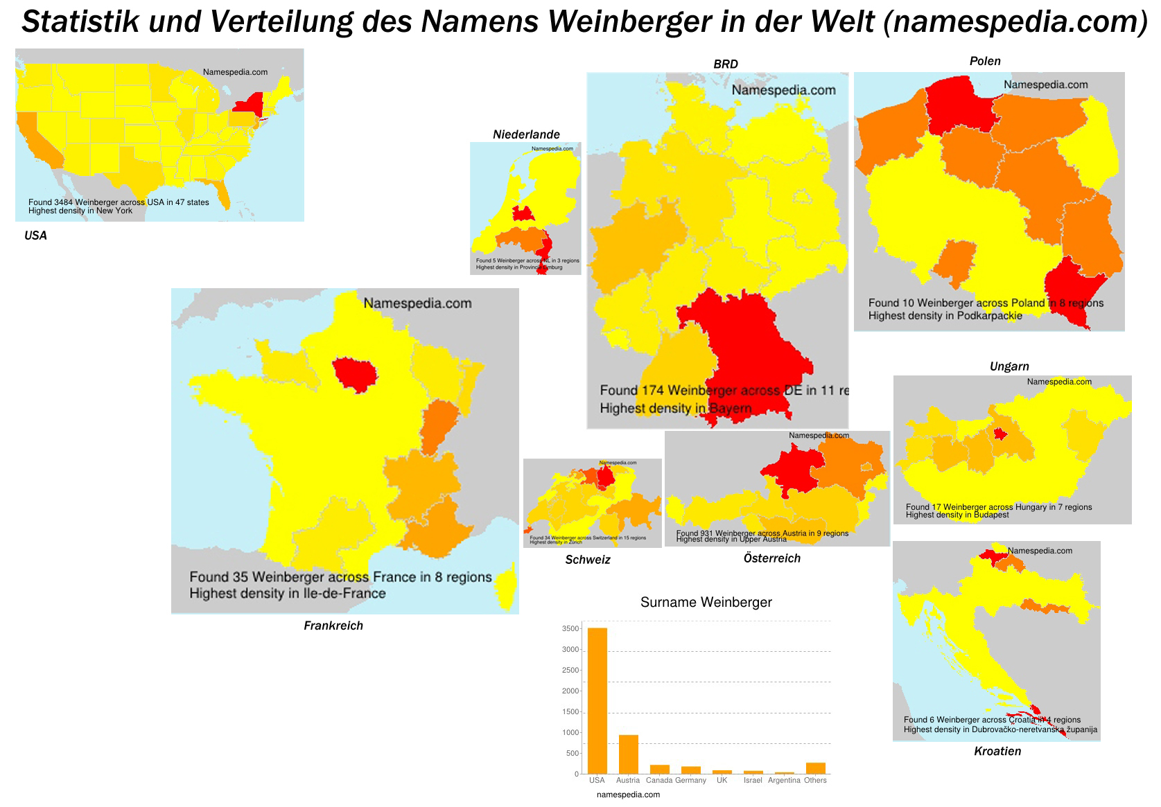 Тоже красивая версия - не отнять. И эта версия очень неплохо сочеталась с моими первичными исследованиями по распространению фамилии Вайнбергер в Европе. Я нашёл пару сайтов (например Geogen, Namespedia), которые вычисляют плотность распространения какой-либо фамилии на определённой территории с помощью телефонных книг. Результаты этих тестов оказались довольно интересными. На сегодняшний день в Европе наибольшее количество представителей фамилии Вайнбергер, имеющих номер в телефонной книге, проживает в Австрии (931) на территории Тироля и в Вене. На втором месте расположилась Германия (174), причём наибольшее количество представителей нашей фамилии проживает в землях Реген, Графенау, Пассау и в Мюнхене. На третьем месте находится Венгрия (17), причём подавляющее большинство Вайнбергеров живут в Будапеште и в его окрестностях. В общем, если очертить территорию, на которой в основном живут представители нашей фамилии, то получится область вдоль Дуная, проходящая от Будапешта и до немецкого Регенсбурга с явной наибольшей концентрацией в Тироле.